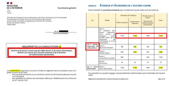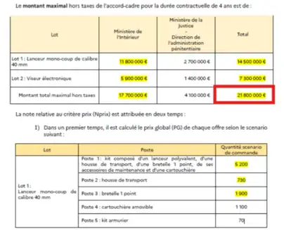 Selon le document, la Gendarmerie nationale et la Police achèteraient respectivement 3 000 et 1 200 lance-grenades avec des munitions non explosives. Un millier d’armes supplémentaires serait acquis par l’administration pénitentiaire française. Au total, ce sont 5 200 armes et autant de viseurs qui seront achetés.