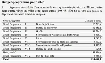 En se basant sur les documents internes de la CPI traitant de sa comptabilité, nous pouvons constater que son budget pour la seule année 2025 est de 195 481 500€ (Résolution ICC-ASP/23/Res.6, Partie I, §A).